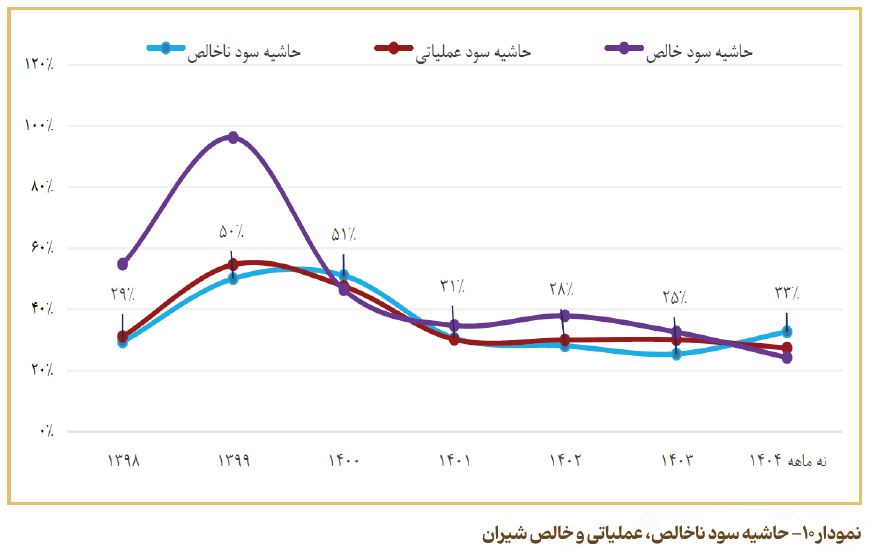 روند تغییرات حاشیه سود ناخالص، عملیاتی و خالص شرکت طی سال‌های مالی ۱۳۹۸ تا دوره ۹ماهه‌ سال مالی ۱۴۰۴، در نمودار ۱۰ نشان داده شده است. همانطورکه مشاهده می‌شود، حاشیه سود شرکت در سال مالی ۱۳۹۹ به بالاترین سطح خود رسیده و پس از آن با نوساناتی همراه بوده است. کاهش تدریجی حاشیه سود در سال‌های اخیر، عمدتاً ناشی از افزایش بهای تمام‌شده مواد اولیه و همچنین افزودن برش‌های برگشتی به سبد فروش شرکت بوده است؛ برش‌هایی که حاشیه سود پایینی دارند و در نتیجه، حاشیه سود کلی شرکت را کاهش داده‌اند. با این حال، ثبات نسبی در حاشیه سود عملیاتی و بهبود جزئی در دوره ۹‌ماهه سال مالی ۱۴۰۴، نشان‌دهنده‌ مدیریت مؤثر هزینه‌ها و حفظ سودآوری شرکت در شرایط متغیر بازار است.