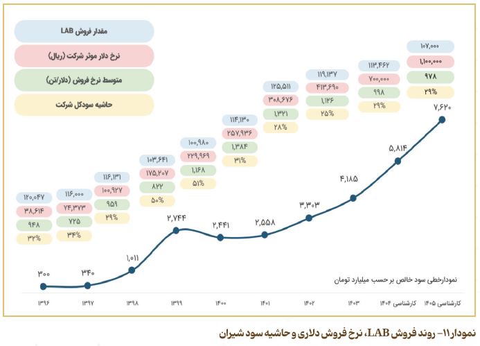 در سال‌های اخیر، سطح تولید و فروش شرکت تقریباً باثبات بوده است، به‌طوری‌که سالانه حدود ۱۷۰ هزار تن نرمال ‌پارافین و نزدیک به ۱۱۷ هزار تن آلکیل ‌بنزن خطی تولید می‌شود و همین ترکیب تولید، حاشیه سود مناسبی را برای شرکت ایجاد کرده است. از ابتدای سال ۱۴۰۵ نیز طرح توسعه واحد LAB2 وارد مدار بهره‌برداری می‌شود که عملاً ظرفیت و حجم فروش را یک پله بالاتر خواهد برد.