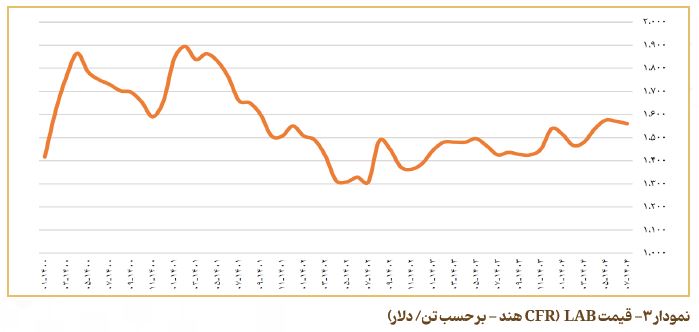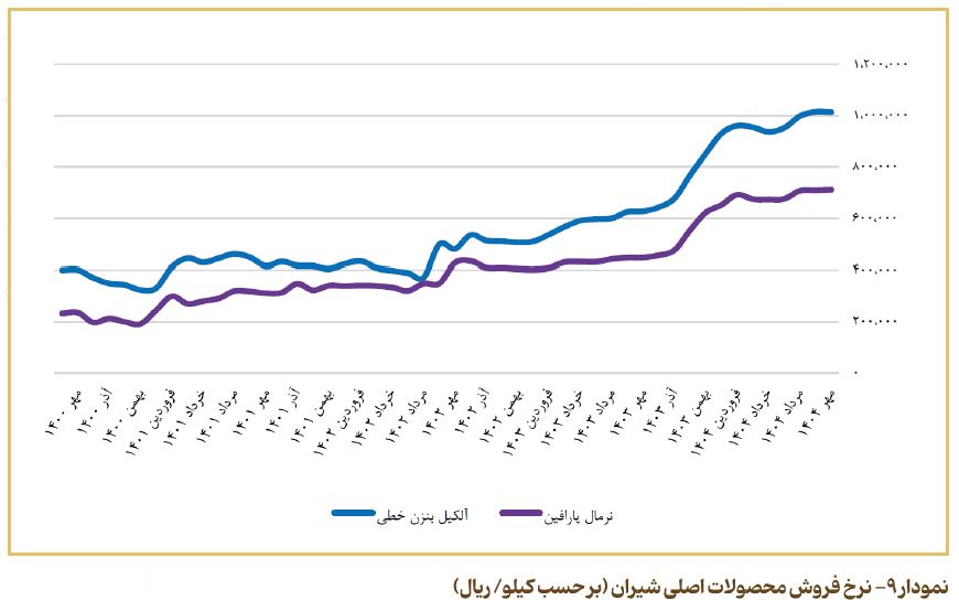 به‌منظور نمایش روند تغییرات قیمتی محصولات اصلی شرکت سرمایه‌گذاری صنایع شیمیایی ایران، نرخ فروش آلکیل ‌بنزن خطی (LAB) و نرمال پارافین (NP) در نمودار ۹ ارائه شده است.