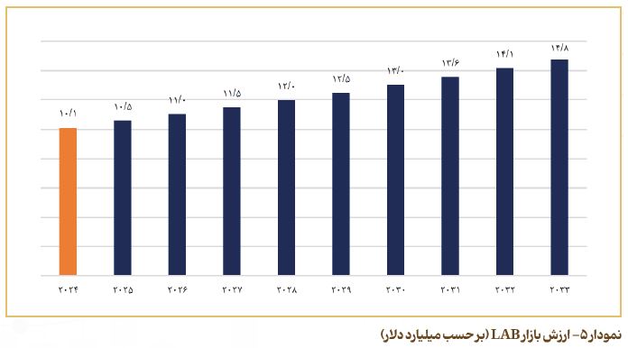 نمودار ۵، روند صعودی ارزش بازار جهانی LAB طی دوره پیش‌بینی ۲۰۲۵ تا ۲۰۳۳ را نشان می‌دهد. بر اساس داده‌های موجود، ارزش بازار LAB در سال ۲۰۲۴ حدود ۱۰.۱ میلیارد دلار برآورد شده است و انتظار می‌رود تا سال ۲۰۳۳ با نرخ رشد سالانه مرکب (CAGR)حدود ۴.۳ درصد، به ۱۴.۸ میلیارد دلار برسد. این افزایش عمدتاً ناشی از رشد مصرف مواد شوینده در صنایع خانگی و صنعتی، توسعه شهرنشینی و ارتقای آگاهی‌های بهداشتی در کشورهای در‌حال‌توسعه به‌ویژه در آسیا و آمریکای لاتین است. افزایش تقاضا برای سورفکتانت‌های زیست‌تجزیه‌پذیر و جایگزینی ترکیبات غیربهینه با مواد مؤثرتر و دوستدار محیط زیست نیز از دیگر محرک‌های رشد این بازار محسوب می‌شود. در همین راستا، دسترسی مناسب به خوراک‌های پتروشیمی، نوسانات قیمت نفت و ملاحظات انرژی، از عوامل تعیین‌کننده در پایداری ارزش بازار LAB در سال‌های آینده خواهند بود. در مجموع، بازار جهانی آلکیل ‌بنزن خطی در مسیر رشد تدریجی قرار دارد و محرک اصلی آن افزایش تقاضای جهانی برای مواد شوینده، بهبود فرمولاسیون‌ها و توسعه فناوری‌های تولید کارآمدتر و سازگارتر با محیط زیست است.