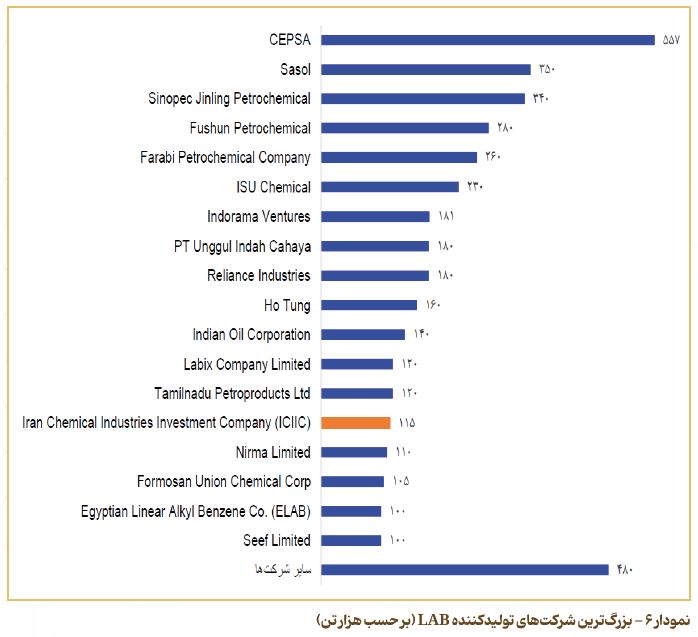 بزرگ‌ترین تولیدکنندگان آلکیل ‌بنزن خطی (LAB) در جهان بر اساس ظرفیت تولید سالانه شناسایی می‌شوند. بر اساس داده‌های موجود، شرکت CEPSA اسپانیا با ظرفیت حدود ۵۷۰ هزار تن در سال، به‌عنوان بزرگ‌ترین تولیدکننده LAB در سطح جهانی شناخته می‌شود. پس از آن، شرکت‌های Sasol آفریقای جنوبی و Sinopec Jinling Petrochemical چین به ترتیب با ظرفیت‌های ۳۵۰ و ۳۴۰ هزار تن در سال، در رتبه‌های دوم و سوم قرار دارند. در جایگاه‌های بعدی، شرکت‌هایی همچون Farabi Petrochemical و Fushun Petrochemical در عربستان سعودی و چین و همچنین ISU Chemical کره جنوبی، از تولیدکنندگان مهم این محصول به‌شمار می‌روند. در منطقه خاورمیانه، شرکت سرمایه‌گذاری صنایع شیمیایی ایران با ظرفیت حدود ۱۱۵ هزار تن در سال، سهم قابل‌توجهی در تأمین نیاز منطقه‌ای دارد و به‌عنوان یکی از بازیگران اصلی بازار LAB در منطقه شناخته می‌شود. به‌طور کلی، تمرکز تولید در مناطق آسیایی و خاورمیانه‌ای بیش از سایر نقاط جهان است، زیرا دسترسی به خوراک‌های پتروشیمی ارزان‌قیمت، هزینه‌های تولید پایین‌تر و رشد تقاضای داخلی، شرایط رقابتی مناسبی را برای این کشورها فراهم کرده است. در نمودار ۶، بزرگ‌ترین شرکت‌های تولیدکننده آلکیل‌ بنزن خطی (LAB) در جهان به همراه ظرفیت سالانه تولید هر یک از آنها نمایش داده شده ‌است.