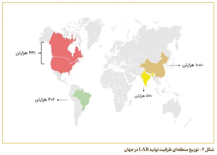 علاوه بر این، شرکت‌های فعال در آمریکای جنوبی مانند Deten Química در برزیل نیز سهم مهمی در بازار منطقه‌ای دارند. در اروپا، کشورهایی همچون اسپانیا و فرانسه با استفاده از فناوری‌های پیشرفته نظیر فرآیند Detal جایگاه خود را در تولید پایدار و کم‌هزینه‌ LAB تثبیت کرده‌اند. در خاورمیانه نیز ایران و قطر با توسعه ظرفیت‌های جدید و سرمایه‌گذاری در واحدهای پتروشیمی مدرن، در مسیر افزایش سهم خود در بازار جهانی گام برداشته‌اند. به‌طور کلی، تمرکز تولید در کشورهایی است که به خوراک‌های پتروشیمی ارزان‌قیمت، نیروی انسانی متخصص و موقعیت جغرافیایی مناسب برای صادرات دسترسی دارند. ترکیب این عوامل در کنار سرمایه‌گذاری‌های تازه در فناوری‌های نوین، موجب شده است صنعت LAB در سال‌های اخیر جایگاه مستحکمی در زنجیره ارزش جهانی محصولات شوینده و بهداشت به‌دست آورد. در شکل ۲، میزان ظرفیت تولید آلکیل‌ بنزن خطی (LAB) به تفکیک مناطق و کشورهای اصلی تولیدکننده، نشان داده شده است.