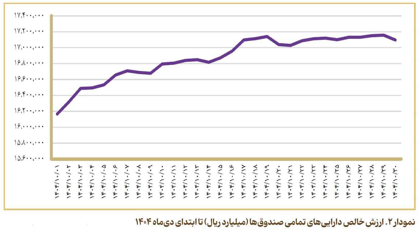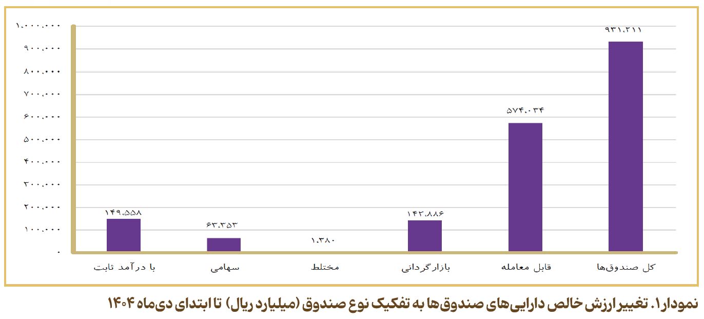 طی دیماه ۱۴۰۴، کل ارزش خالص داراییهای صندوقهای سرمایهگذاری تقریباً با ۹۳۱ هزار میلیارد ریال افزایش، به مبلغ ۱۷,۰۹۷ هزار میلیارد ریال رسید. بیشترین افزایش ریالی در ارزش خالص داراییها مربوط به صندوقهای قابلمعامله بوده که نسبت به ابتدای ماه حدود ۵۷۴ هزار میلیارد ریال معادل ۹/۷ درصد بوده است. صندوقهای با درآمد ثابت نیز تقریباً با ۱۵۰ هزار میلیارد ریال افزایش معادل ۲/۳ درصد، رتبه دوم را به خود اختصاص دادهاند.