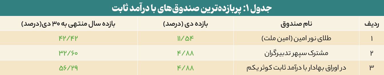 در جدولهای ۱ تا ۴، صندوقهای سرمایهگذاری با بیشترین بازدهی در هر گروه از صندوقهای با درآمد ثابت، سهامی، مختلط و قابلمعامله در بورس ارائه شده است. از بین صندوقهای با درآمد ثابت، صندوق « طلای نور امین (امین ملت)» بیشترین بازدهی را کسب کرده است. بازدهی این صندوق در دیماه ۱۴۰۴ برابر با ۱۱/۵۴ درصد و بازدهی یک سال گذشته آن برابر با ۴۲/۴۲ درصد بوده است.