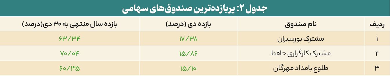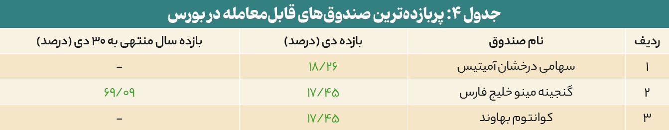 صندوق «سهامی درخشان آمیتیس» تحت نماد «آمیتیس» با بازدهی ۱۸/۲۶ درصدی، بهترین عملکرد را در میان صندوقهای قابلمعامله در بورس در دیماه ۱۴۰۴ داشته است. صندوق «گنجینه مینو خلیج فارس» با نماد «خلیج» نیز با ۱۷/۴۵ درصد بازدهی، رتبه دوم را کسب نموده است.