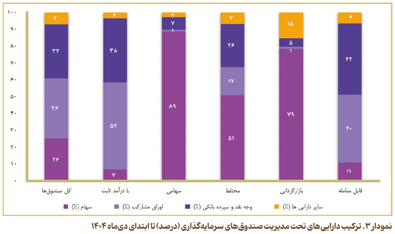 صندوقهای سرمایهگذاری مجموعاً ۲۶ درصد از منابع مالی خود را در سهام، ۳۶ درصد را در اوراق مشارکت، ۳۲ درصد را در سپردههای بانکی و وجه نقد و حدود ۷ درصد را در سایر داراییها، سرمایهگذاری کردهاند. در نمودار ۳، ترکیب داراییهای تحت مدیریت صندوقهای سرمایهگذاری نشان داده شده است